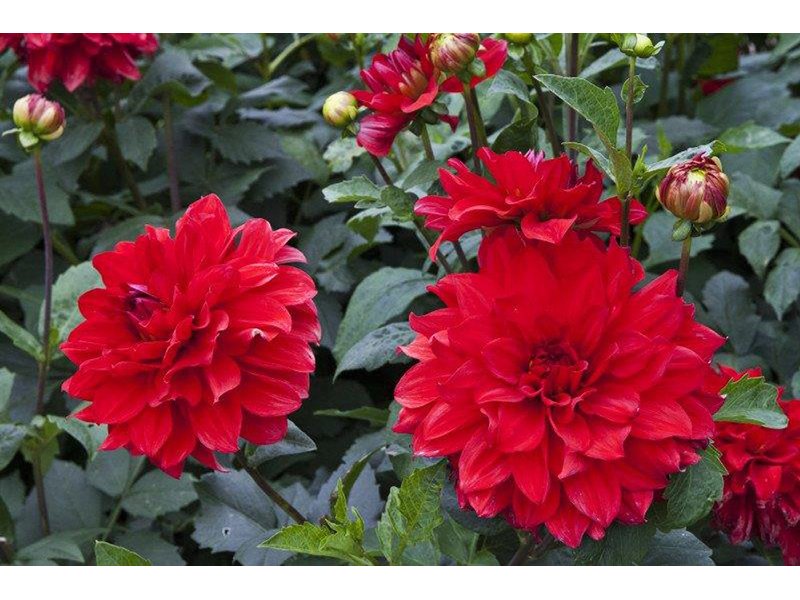 Клубни георгины махровой Барбаросса (Dáhlia variabilis Barbarossa) дадут возможность вырастить на участке куст высотой от 60 до 100 сантиметров. С июля по сентябрь он будет радовать красивыми махровыми цветами размером 10-12 сантиметров. Лепестки ярко-красного цвета имеют заостренные края и плоскую середину. На каждом стебле раскрывается по 3 цветка. Клубни высаживают в рыхлую влажную почву, смешанную с минеральными удобрениями и органикой, когда на улице установится теплая погода. Не поливают, пока над землей не появится первый росток. Возле куста сразу устанавливают опору.