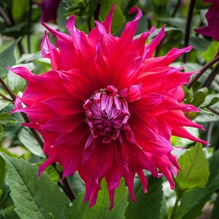 Саженцы и рассада георгины декоративной Джокондо (Dahlia cultorum) относятся к самым крупным сортам, с цветами размером до 25 см. Их окрас пурпурный, иногда красный, встречается и фиолетовый, густо насыщенный. Лепестки крупные, широкие у основания, сужающиеся к концам.