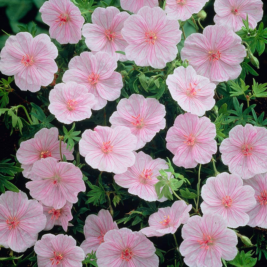 Саженцы Герани кроваво-красной Striatum (Geranium sanquineum) – травянистое многолетнее растение с хорошо развитой корневой системой. Устойчиво к морозам, благодаря чему подходит для высаживания в открытом грунте в Центральной полосе России, а также в северных и горных районах Скандинавии. Высота герани Стриатум составляет 15-20 см, а в диаметре растение достигает 30-40 см. Его ярко-зеленые многодольные листья красиво гармонируют с ежно-розвыми остроконечными цветками-чашелистиками с розовыми жилками. Многолетник неприхотлив к составу почвы и уходу. Его полив проводят по мере высыхания грунта, а единственным условием для роста является отсутствие застоя грунтовых вод.