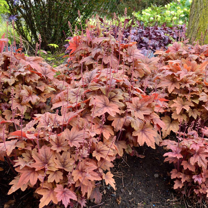 Рассада гейхеры Свит Ти (Sweet Tea) обладает завораживающими листьями похожими по форме на кленовый. Цветовая гамма листвы разнообразная от оранжевого до коричнево-бордового цвета. Особенно привлекательно выглядит контраст красок куста поздним летом и осенью. Старые листья становятся насыщенно-коричневого цвета, а молодые оранжевого. Достоинства: