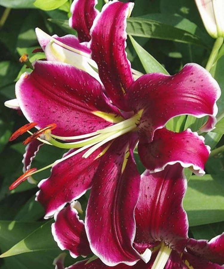 Лилия Восточная "Вангелис" - это великолепное растение с насыщенно-пурпурными цветками, украшенными четко очерченной белой каймой. Диаметр цветка достигает 20 см, что делает его по-настоящему величественным и привлекательным. Высота растения может достигать от 60 до 120 см, что позволяет создать эффектные композиции в саду или на клумбе.