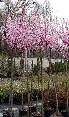 Саженцы Миндаля трехлопастного на штамбе (Prunus triloba) – эффектный кустарник, сменяющий листья каждый сезон. За свою красоту многие называют его японской вишней, но ничего общего, кроме внешнего сходства с сакурой у него нет. Цветы располагаются на побегах, образуют группку из двух бутонов. Лепестки имеют разные оттенки розового цвета. Цветёт этот вид миндаля в апреле-мае.