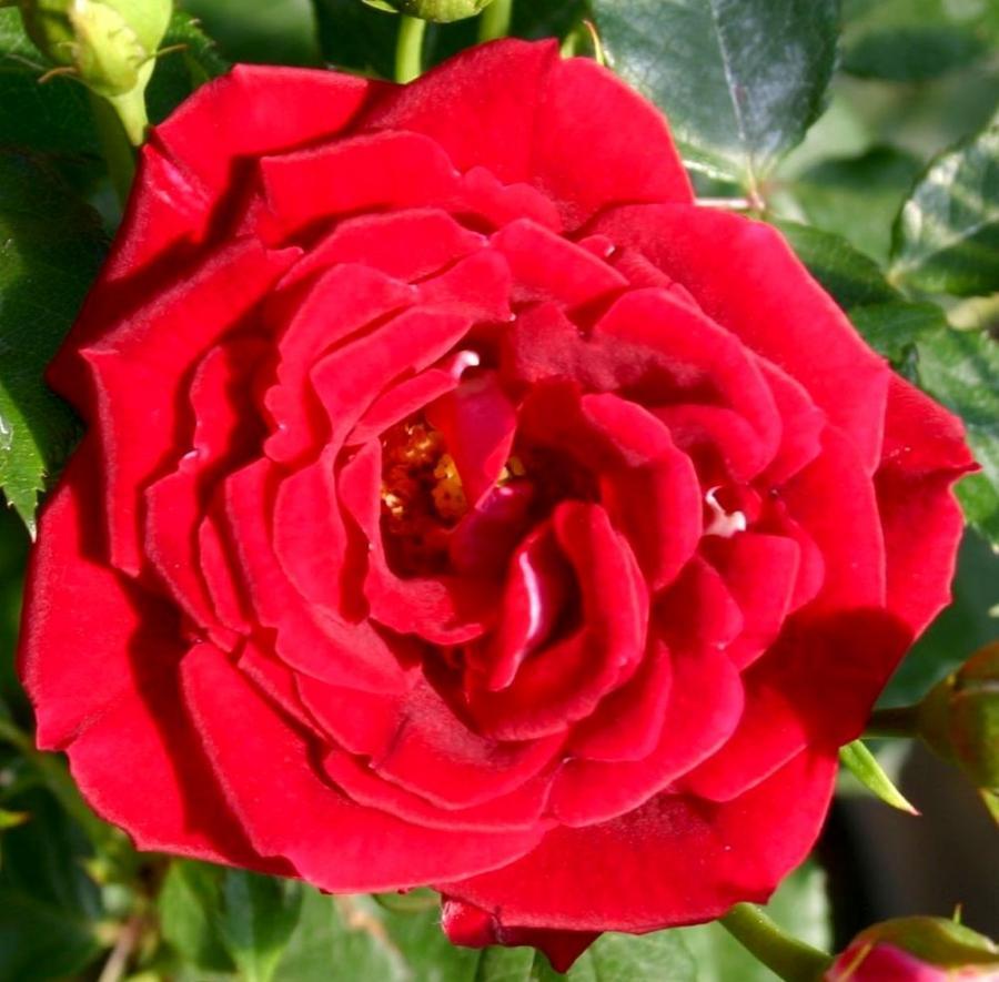 Рассада розы миниатюрной Майди (Maidy) вырастет в привлекательные кусты, густо усеянные ярко-красными цветами. Высота взрослых компактных растений едва достигает 30 см, что позволяет использовать розу для посадок в контейнерах или горшках, и легко переносить на новое место. Диаметр цветков 4-5 см. Побеги сильно ветвистые, усеяны мелкой зеленой листвой. Сорт цветет до поздней осени, затем образует семена. Особенности розы Майди: