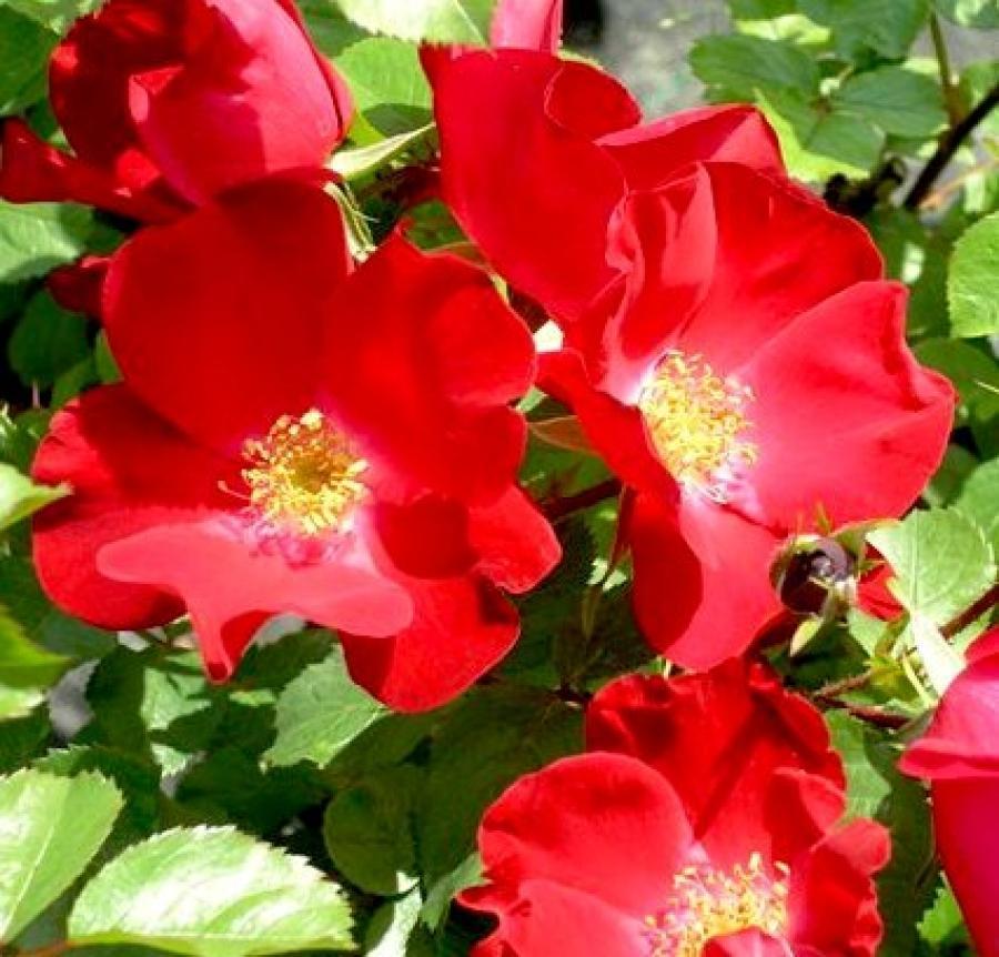 Саженцы розы парковой Робуста (Robusta): выносливый и эффектный сорт будет украшать сад ярко-красными цветами на фоне густой зеленой листвы до конца сезона. Полумахровые цветки простоту форм полностью компенсируют необыкновенно глубоким малиново- красным цветом, с желтыми тычинками в серединках. Лепестки крупные и слегка кудрявые.