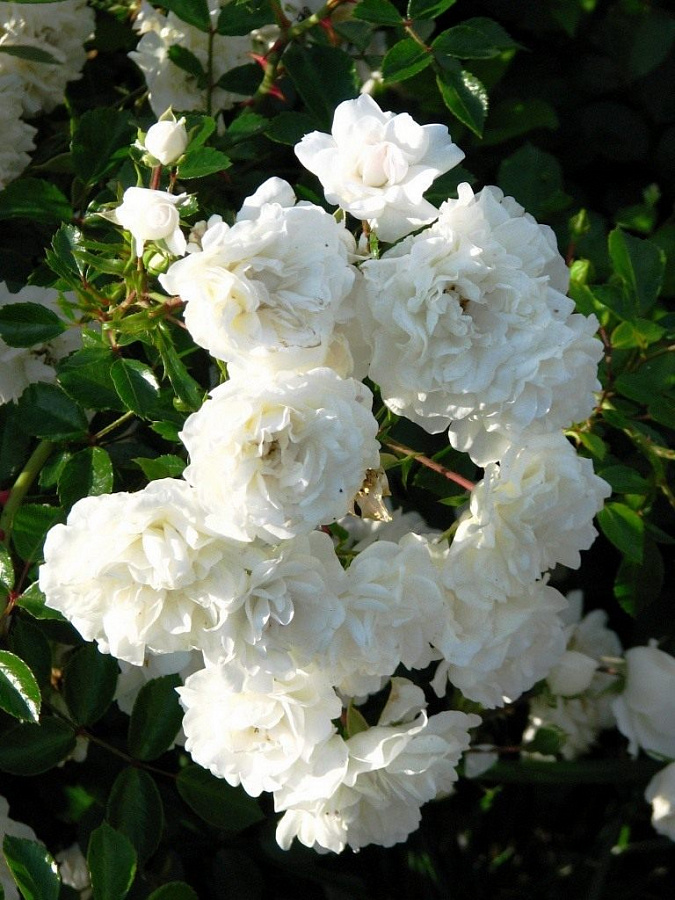Саженцы розы почвопокровной Sea Foam идеально подходят для невысокой живой изгороди, использования как почвопокровного растения или создания каскада на склоне. Культура хорошо растет в полутени и на не очень богатых почвах. Высота куста 60-100 см, а ширина – 100 см. Цветы появляются на колючих, длинных, поникающих побегах в больших соцветиях. Бутоны небольшие, диаметром 5-6 см, бело-кремовые с небольшой розовинкой. Цветет роза почвопокровная Sea Foam с конца мая и до осенних заморозков.